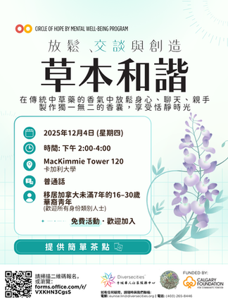 Relax with the soothing scents of Chinese traditional herbs — enjoy conversation, craft your own herbal sachet, and take some peaceful time for yourself, in collaboration with the UCalgary Seed Library. 這次活動與UCalgary Seed Library合作,參加者將在傳統中草藥的香氣中放鬆身心、聊天、親手製作獨一無二的香囊,享受恬靜時光!